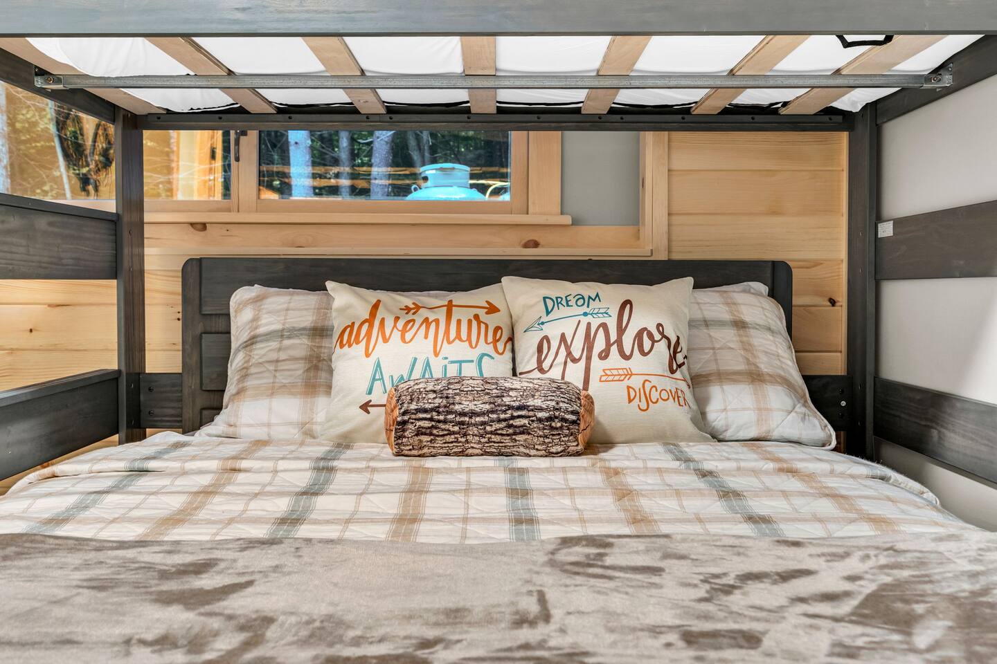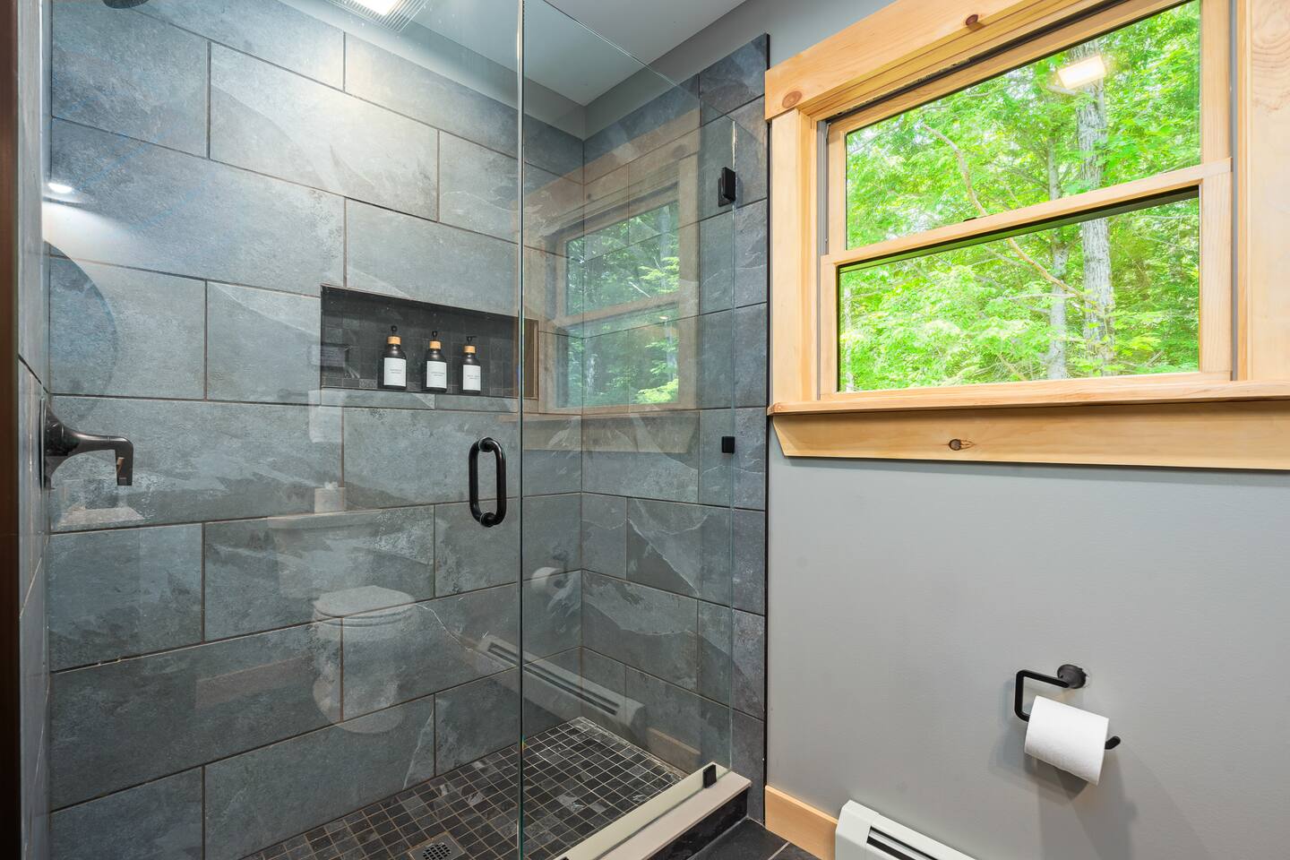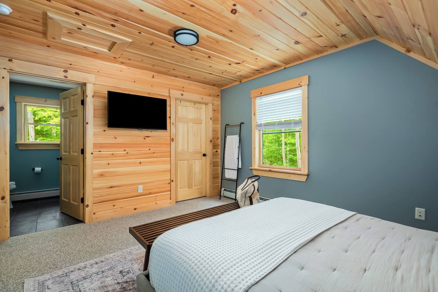 Upstairs boasts two master bedrooms, one with a queen bed and the other with a king. Both include organic cotton quilts, bamboo sheets, smart TVs, en suite full baths, and walk-in closets for a luxurious stay. The king suite also offers a workspace with stunning seasonal lake and mountain views.