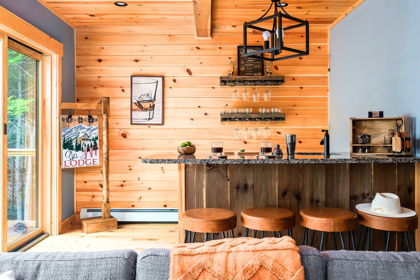 The heart of Twin Lakes Chalet radiates style and comfort, blending mid-century modern design with elevated mountain decor. The open floor plan encourages endless opportunities for laughter, shared stories, and meaningful connections. The wet bar, featuring a fridge and wine cooler, opens seamlessly into the cozy living room, where a gas fireplace invites everyone to gather. A smart FireStick TV stands ready for your streaming nights.