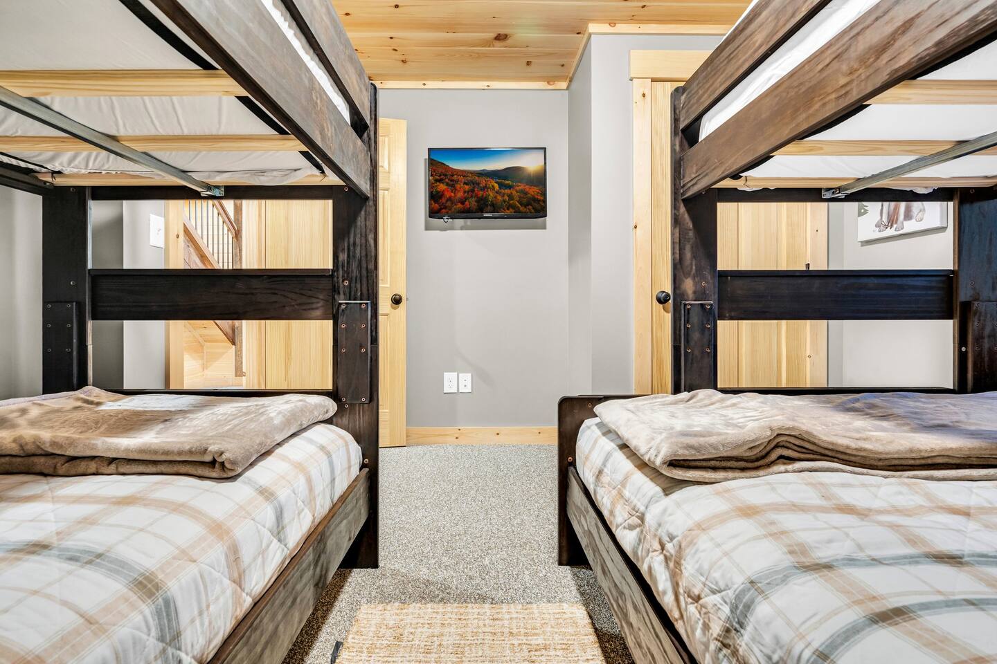 On the lower level, discover two more inviting bedrooms. The first is a charming bunk room with a twin over full and a twin over twin bed, plus its own TV for entertainment. The fourth bedroom includes a roomy twin over queen bed, also equipped with a smart TV for personalized viewing.